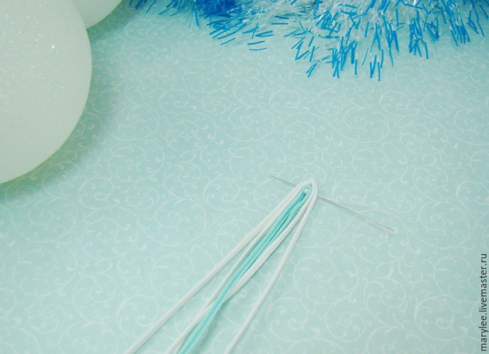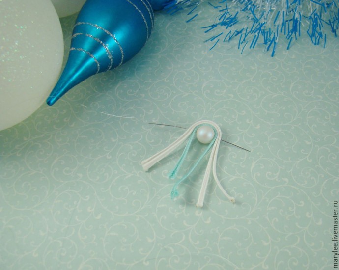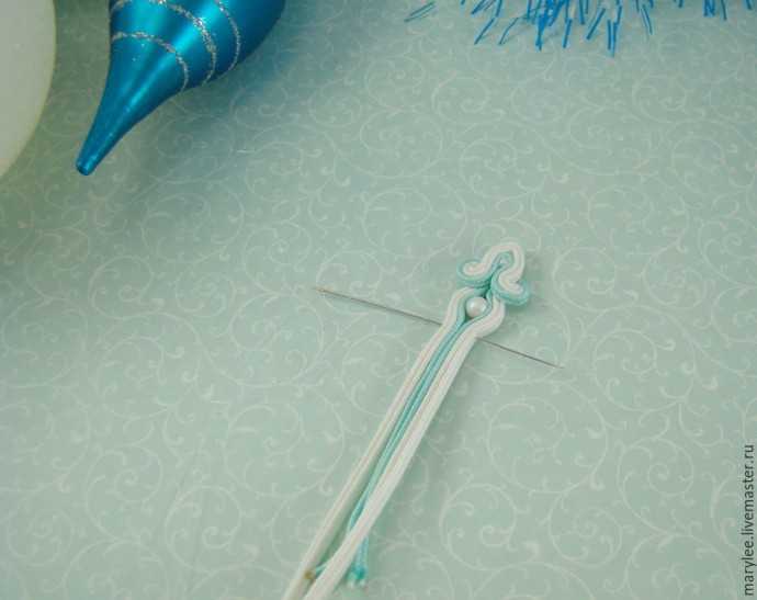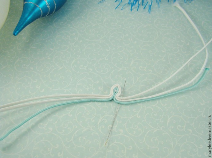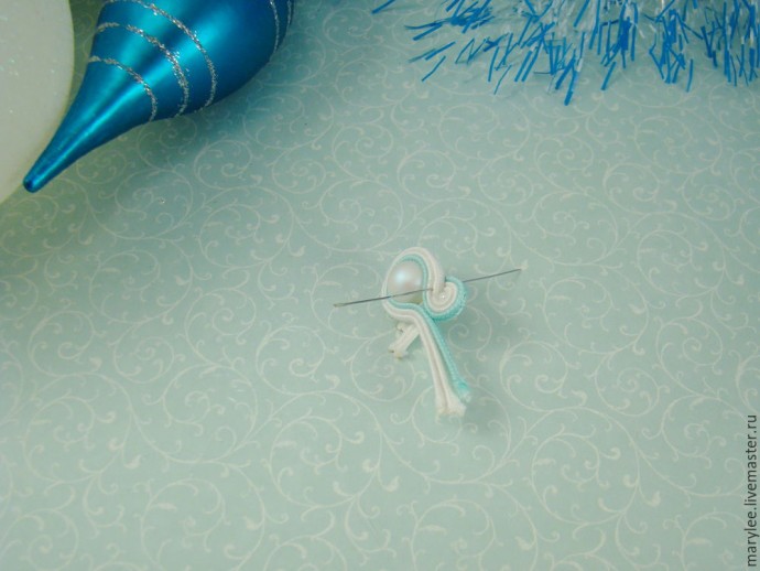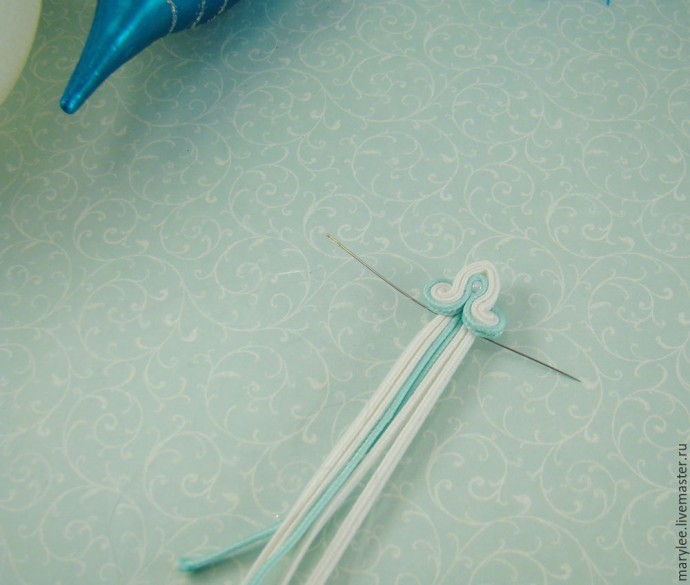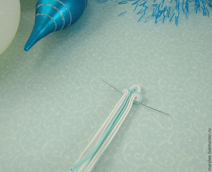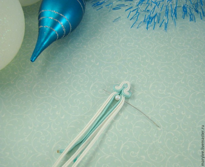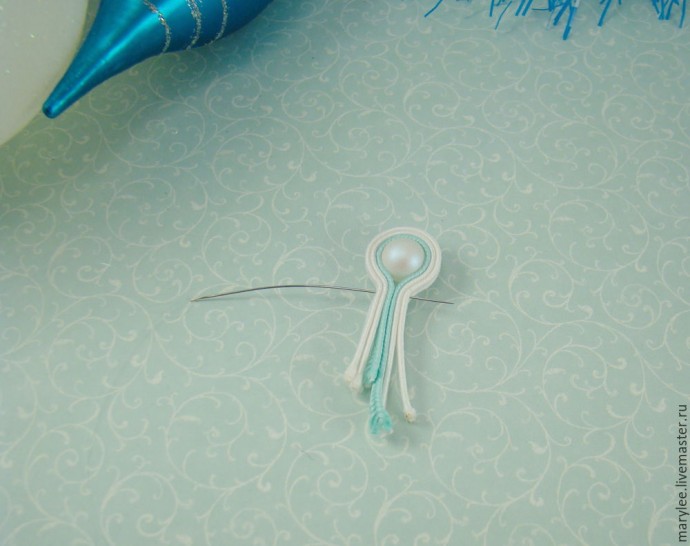 Теперь делаем следующий элемент. Берем три отрезка сутажа длиной примерно 10 см, огибаем ими жемчужину 8 мм, прошиваем.