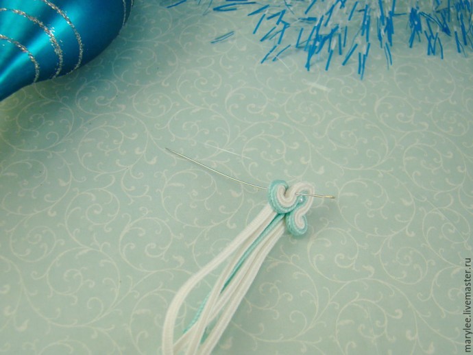 Соединяем несколькими стежками концы сутажа, обрезаем и оплавляем зажигалкой кончики. Таких элементов нам нужно 6 штук.