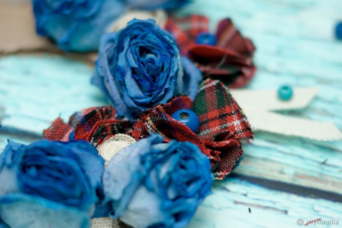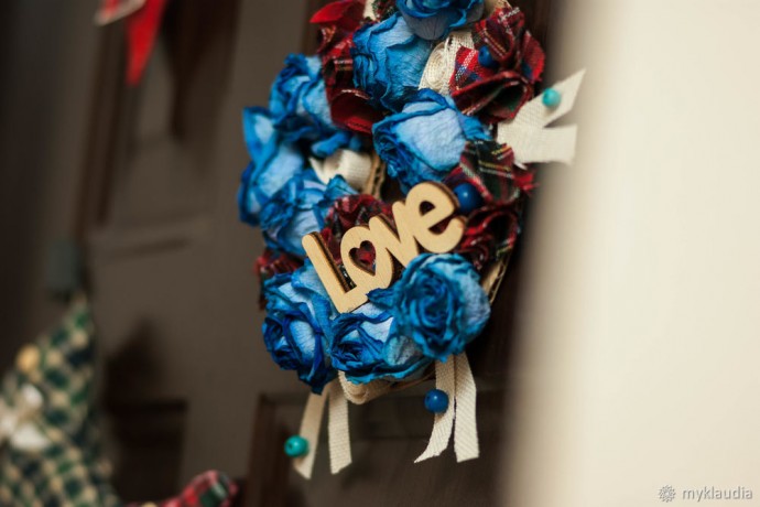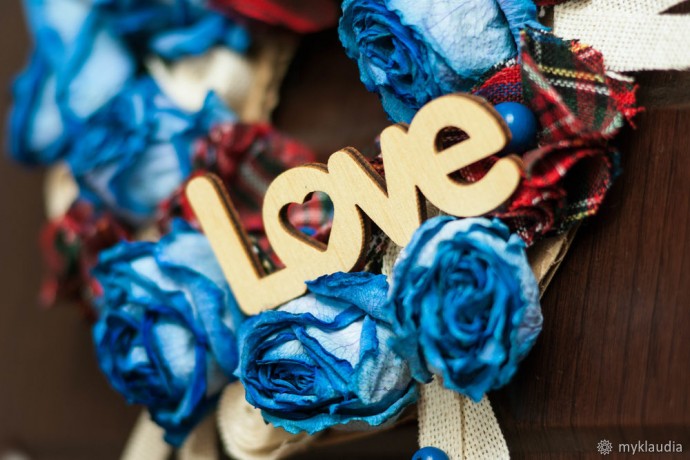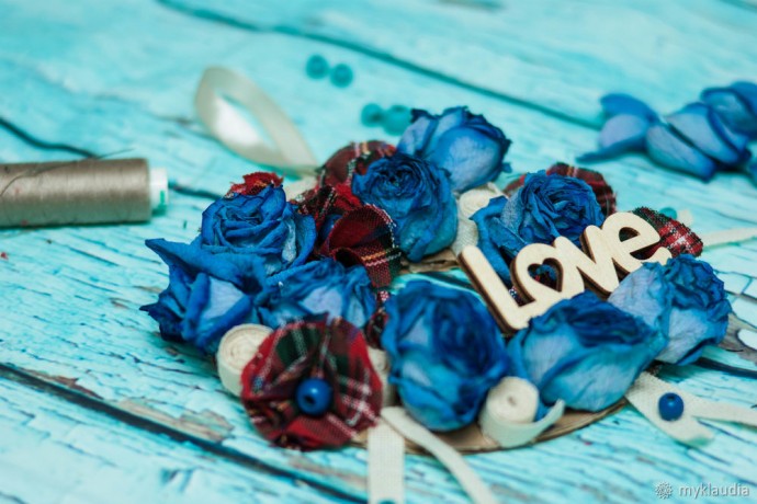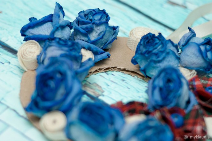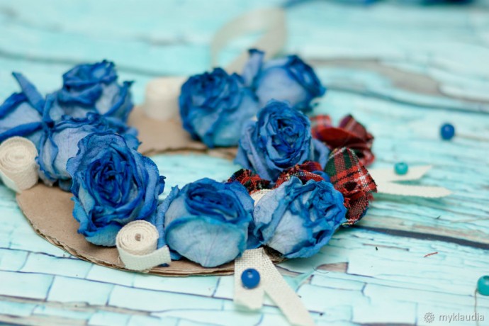 У меня остались розочки после для рождения. Чудесный букет из синих роз. Они засохли, и было жалко их выбрасывать. Даже в таком виде они смотрелись неплохо. Я отделила бутоны от стебля, и появилась идея создания декоративного веночка на рождество из подручных материалов.