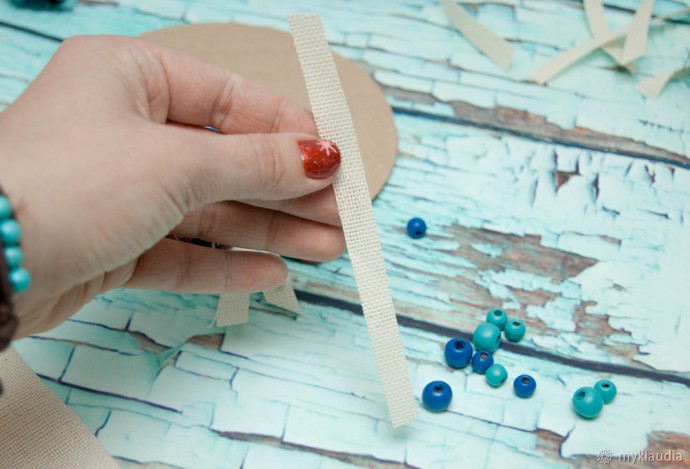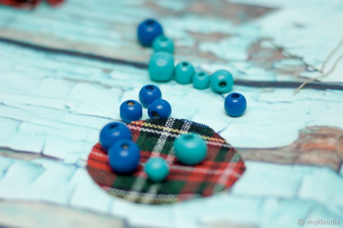 И еще к декору добавляем деревянные бусины в цвет композиции. У меня они синие и голубые.