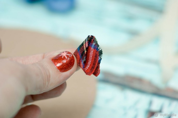 Приступим к декору. На нашу основу приклеиваем розочки. Порядок не имеет значения. Вы сами творите и вы главный в этом. Поэтому приклеиваем так, как нам нравится. Следом приклеиваем наши ролики из ткани. Я их приклеиваю близко к розочкам, чтобы разграничить и разбавить яркие цвета.