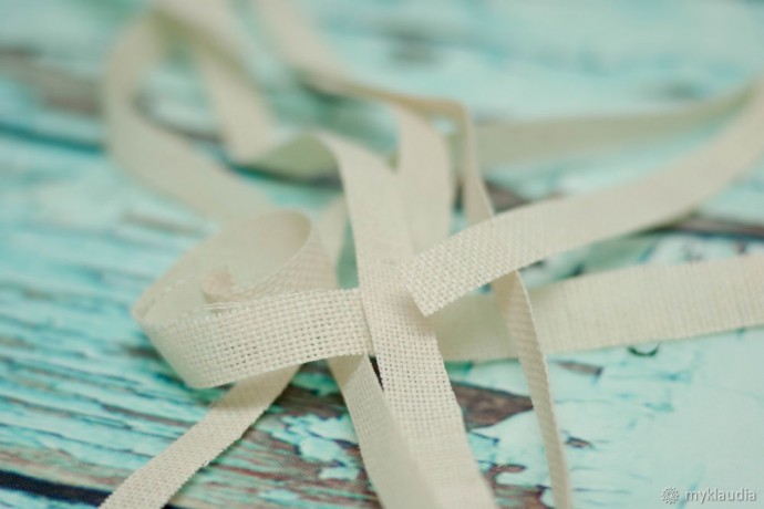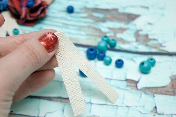 Когда есть основа, можно приступать к декорированию. Потребуется нарезать полоски из светлой хлопковой ткани. Я использую суровую двунитку, она твердоватая и при нарезании держит форму, как будто накрахмалена. Примерно 7-8 полосок потребуется.