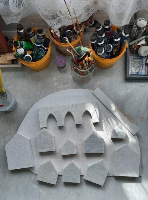 Грунтуем белой акриловой краской домики и фон-фанеру.