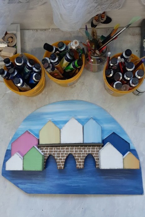 Красим домики в нужные цвета. Мост я прорисовала с помощью трафарета.