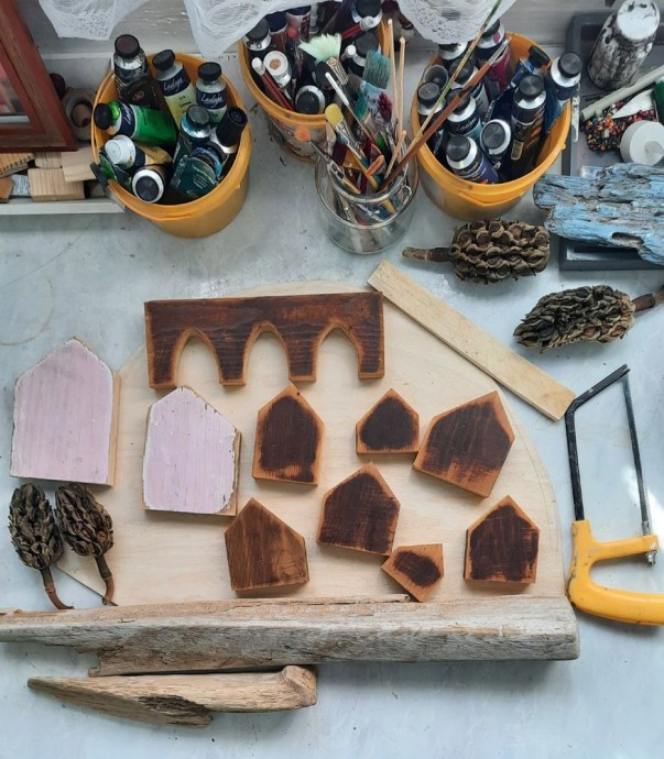 Выпиливаем домики разных размеров из доски и зашкуриваем.
