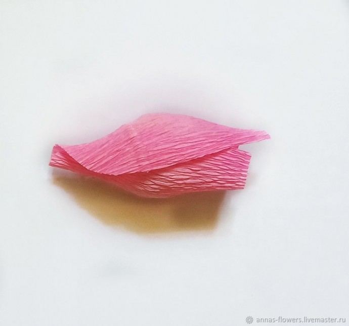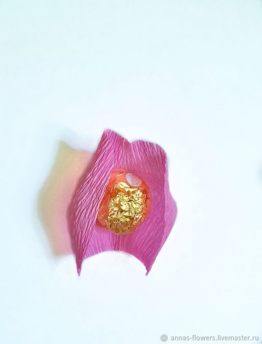 Приклеиваем первый просто растянутый лепесток к заготовке с конфетой на том же уровне.