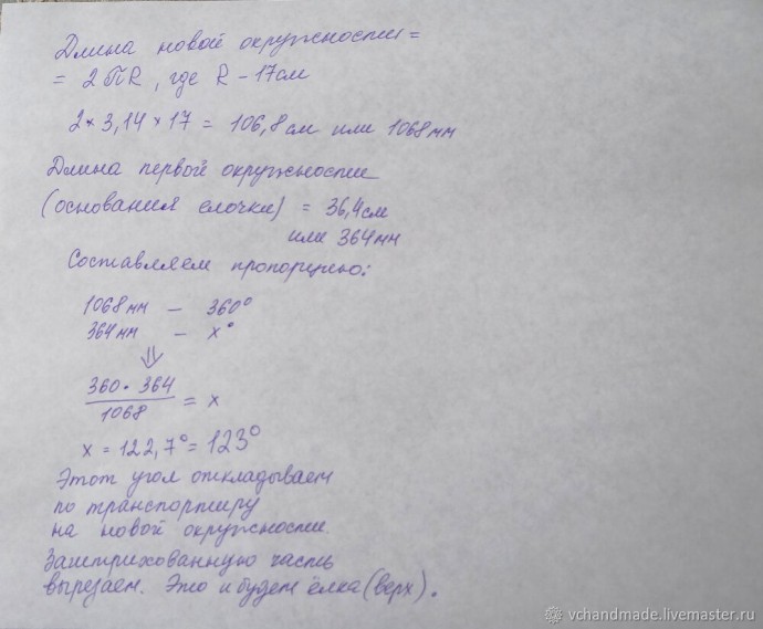 Затем чертим треугольник и вычисляем радиус новой окружности для построения конуса-развертки собственно самой елки.