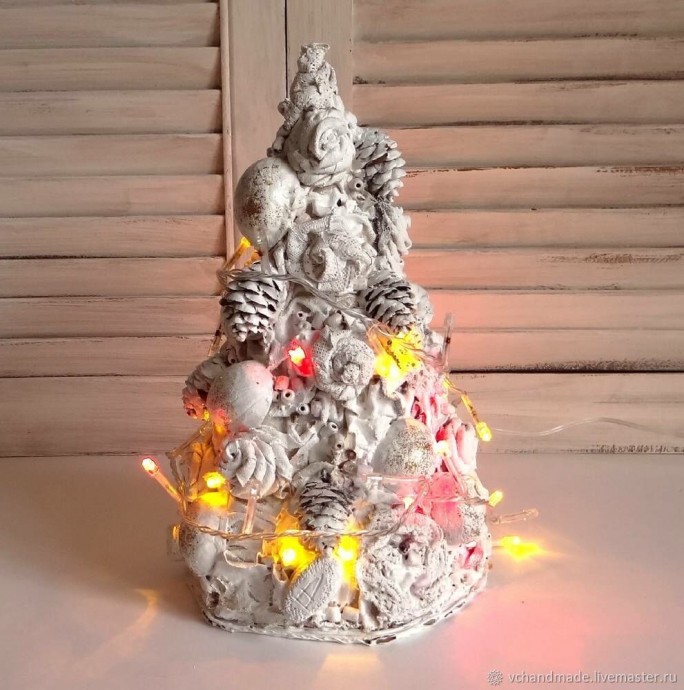 После высыхания лака наносим на заготовку толстый слой шпатлевки и сразу клеим в нее все наши приготовленные шишки, розочки из ткани, половинки скорлупы от орехов. В свободные места вставляем бусины или бисер.