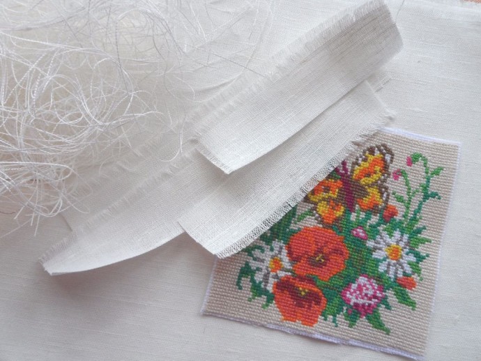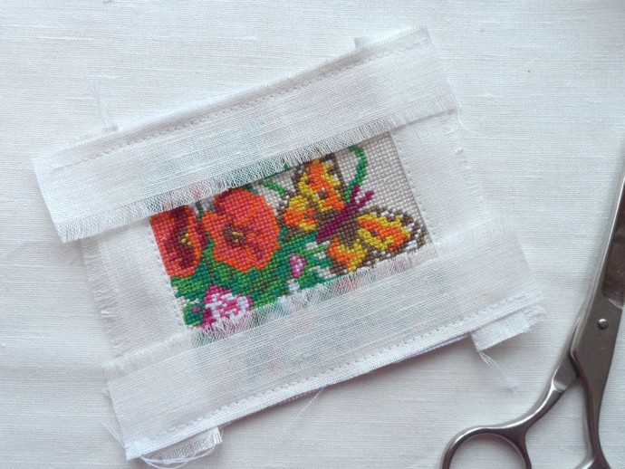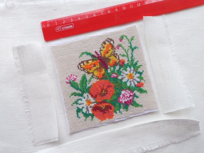 Нарезала 2 полоски длиной, равной стороне вышивки и 2 полоски длиной, перекрывающей концы маленьких полосок.