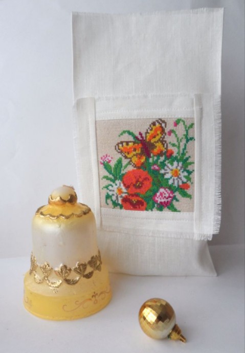 Мне приятельница отдала свои работы — вышивки крестиком периода освоения этой техники. Они имеют неровные края и совсем маленькие поля. Попросила найти им применение при оформлении мешочков для рождественских подарков изо льна. Мотивы совсем не рождественские, но я подумала,что именно в Рождество нужно помнить о красоте этого мира.