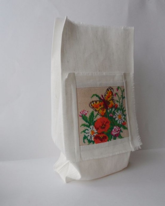 Сначала пришила вышивку, затем сделала боковые швы. Сложила мешок как пакет. Мешочек плотный и держит форму.