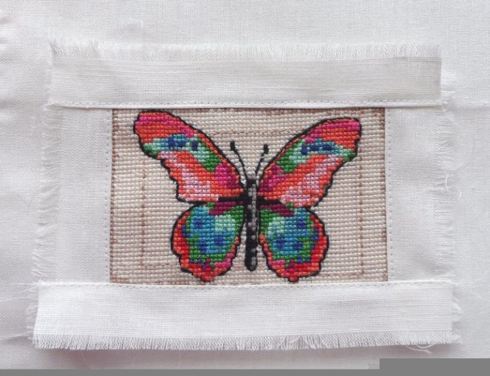 Композиция меня, конечно, не устраивает. Окантовка наступает на рисунок из-за малого размера вышивки. Ну пусть будет такой вид из окошка, которое имитируют полоски ткани.
