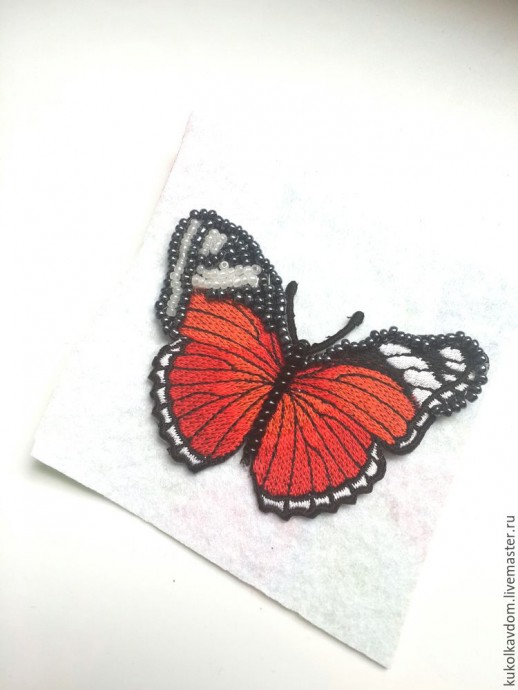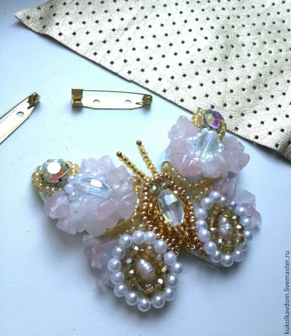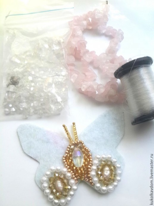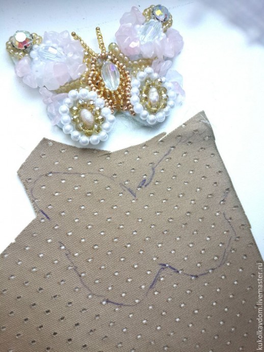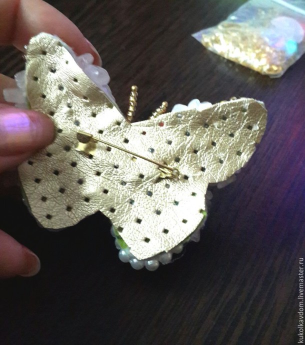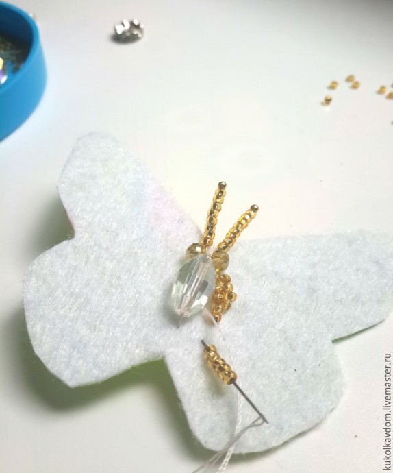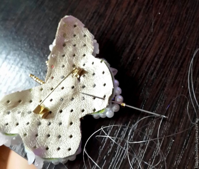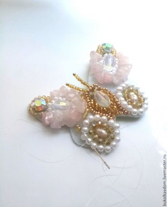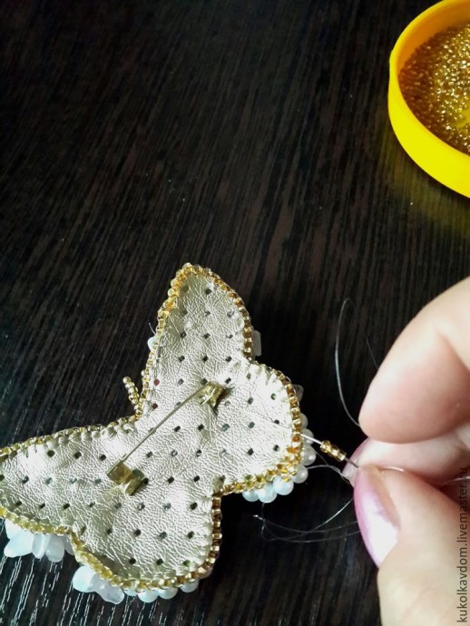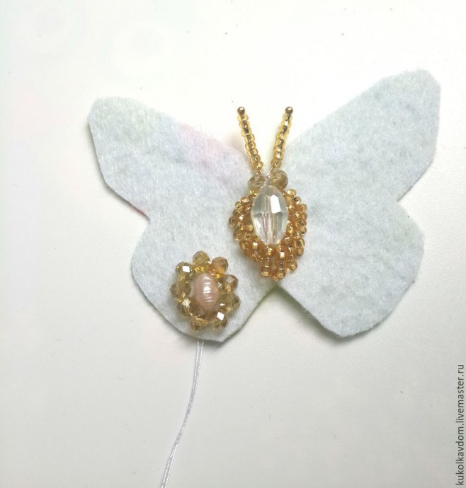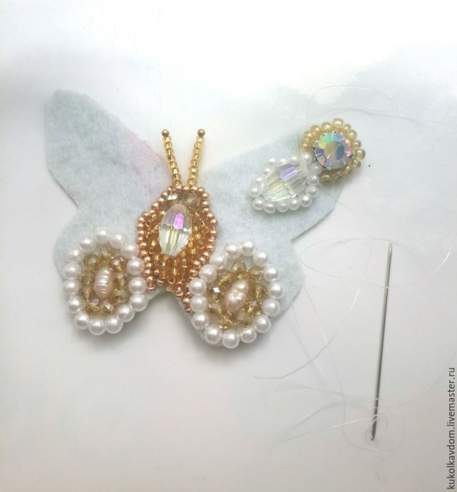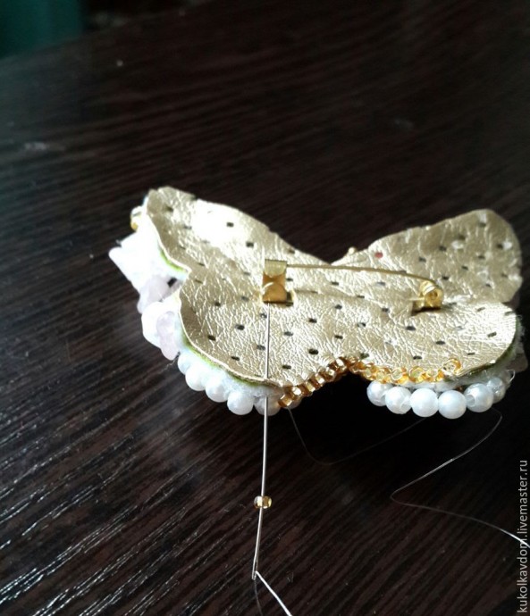 Приступаем к оформлению крыльев. Я пришиваю жемчужинку и обрамляю ее бусинами.