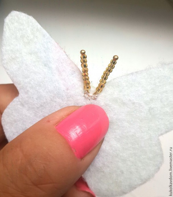 Делаем усики. У меня два пина 25 мм с шариком. Размер любой, как вам нравится. Надеваем бисерины, на конце делаем колечко, пришиваем к основе.