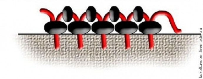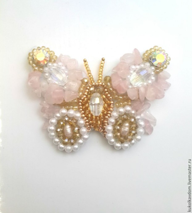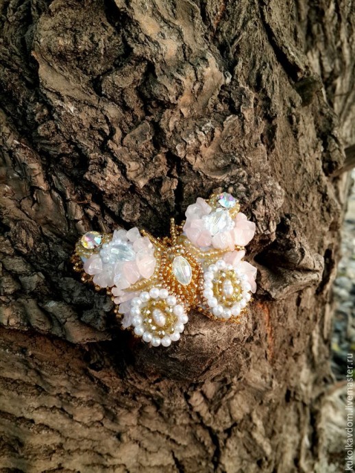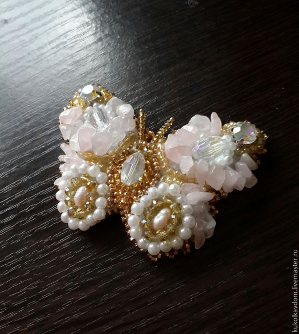 Двигаемся вверх. Я использовала каменную крошку из розового кварца. Камушки тяжелые, их я пришивала двойной леской.