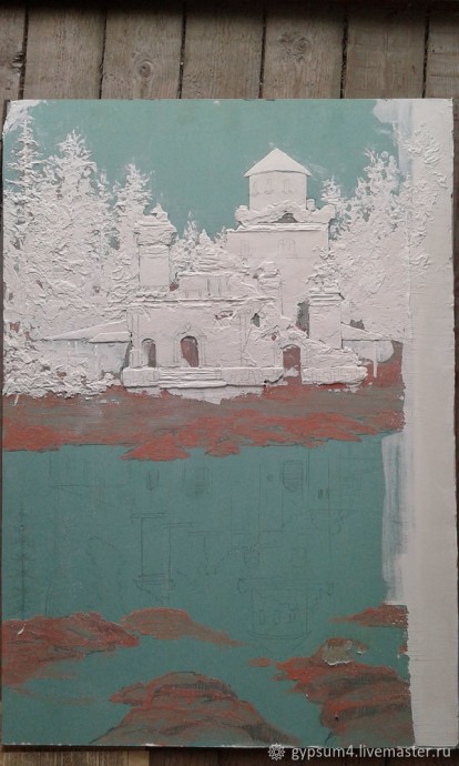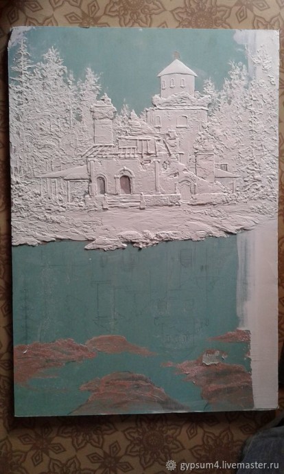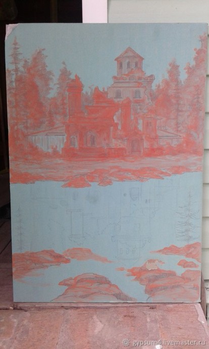 В данной работе нет лепного среднего плана. Это будет отражение в воде. Я никогда не леплю небо и спокойную воду. Эти части изображения плохо смотрятся в объёме, их нужно только рисовать. Переходим к ближнему плану, это камни. Намечаем.
