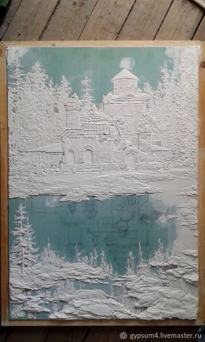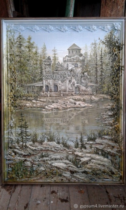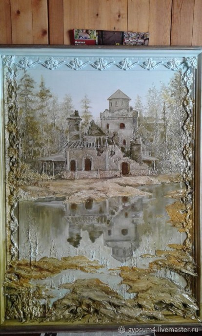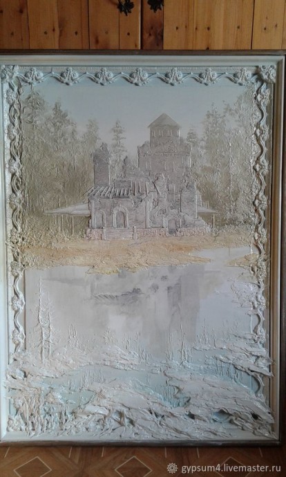 В завершении небольшое отступление. Огромное значение в барельефе играет освещение. Если работа большого размера и нанесена на стену, то ей обязательно нужна индивидуальная подсветка. Данный рельеф с рамой имеет размер 77х103 см. Это не много, но если изменить направление подсветки, то и работа выглядит по-другому. Это та же работа, но с другим освещением. Нет направленного света, он общий. Думаю, разница заметна.