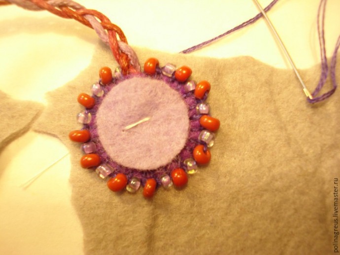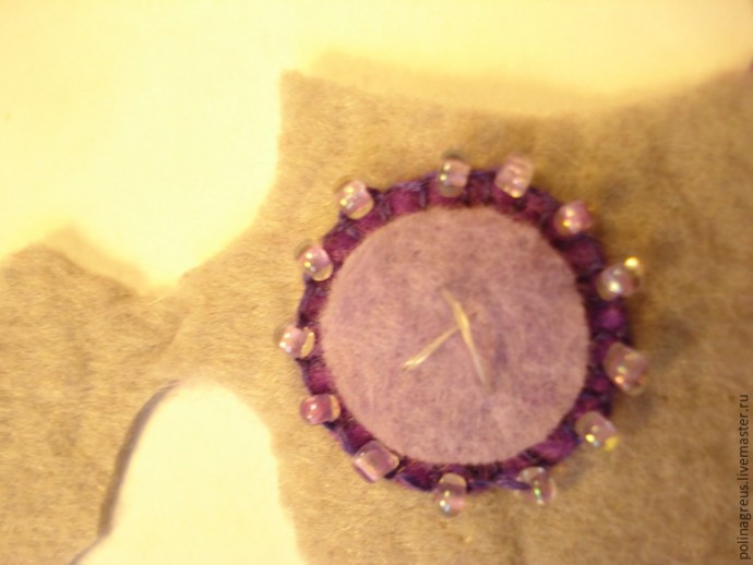 Вырезаем круг (сначала я вырезала два, но потом от верхнего за ненадобностью отказалась), приметываем его к основе и обшиваем петельным швом с мелким бисером через стежок.