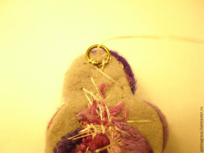 Теперь отыскиваем маленькое колечко и пришиваем его к изнанке получившейся детали таким образом, чтобы его кончик слегка выдавался за край.