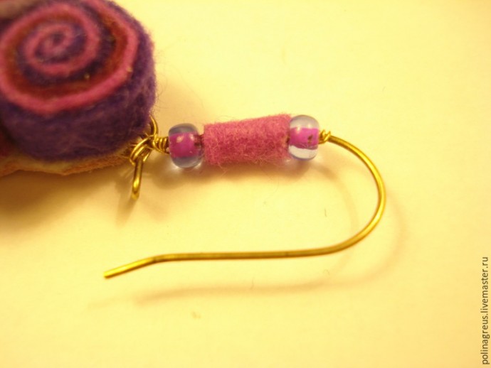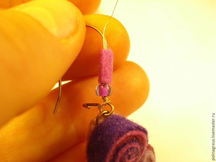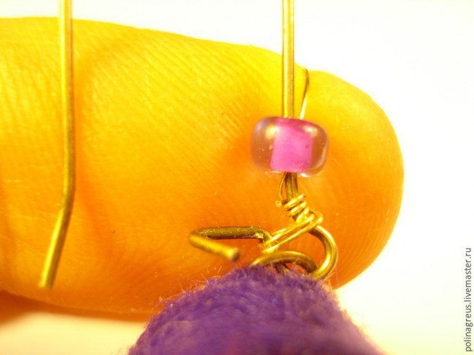 Теперь пора сажать на предназначенное ей место саму сережку, потому что потом будет поздно. Насадив сережку, фиксируем петельку 2-3 оборотами проволоки, чтобы сережка не покинула нас никогда и ни за что.
