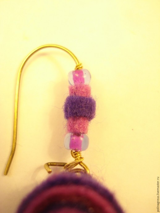 В качестве завершающего штриха я решила добавить еще одну узкую полоску фетра контрастного цвета. Вырезала полоску шириной 2 мм, закрутила посередине уже имеющейся ... и чуть было не решила носить ее без сережки