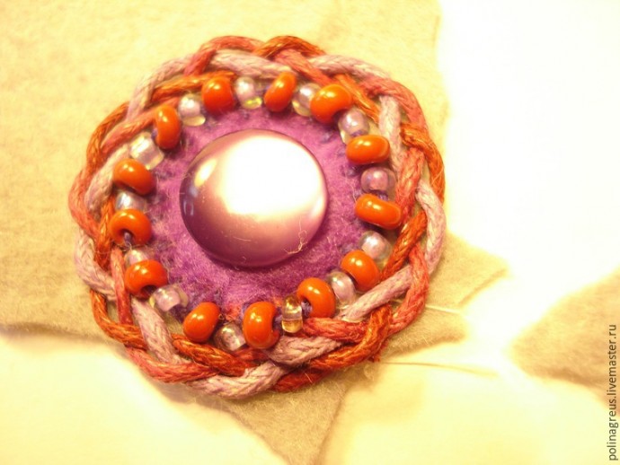 Надо не забыть оставить участок, в который будет прятаться кончик хлопковой косички. Я забыла и пришлось распустить пару стежков. Крепим под кружок кончик косички. Косичка, кстати, у меня осталась еще от колье. У кого не оказалось — ничего не поделаешь, придется плести.
