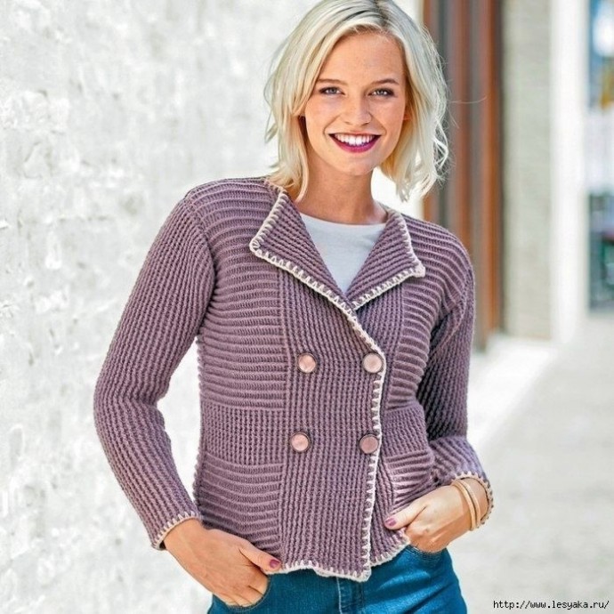 Пряжа (50% натуральной шерсти, 30% альпака, 20% полиамида; 110 м/50 г) — 700 (750) 800 г цв. мальвы; крючок №4; 4 пуговицы (диаметр 44 мм); остаток светло-бежевой пряжи средней толщины.