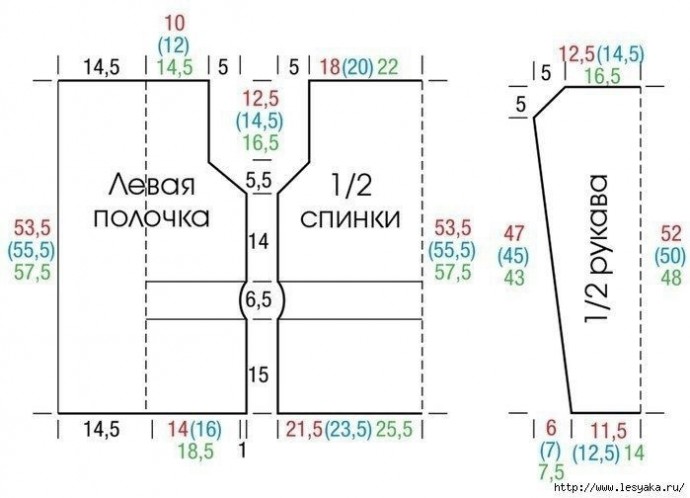 Через 47 (45) 43 см от начального ряда пропустить для низкого оката рукава с обеих сторон 2 п. и затем в каждом следующем ряду еще 4 x 2 п. и 2 x 1 п.