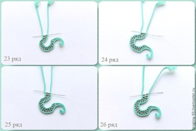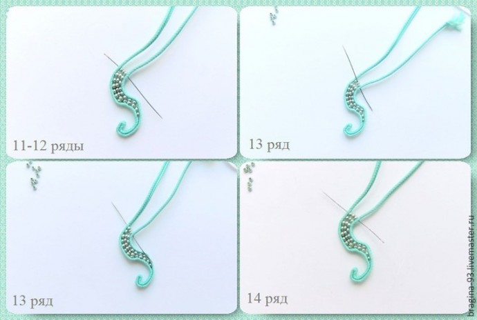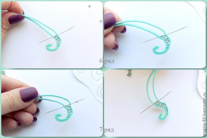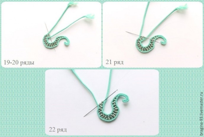 6 ряд: вводим иголку через одну бисеринку предыдущего ряда, нанизываем на иглу 2 бисеринки и прошиваем через сутаж.