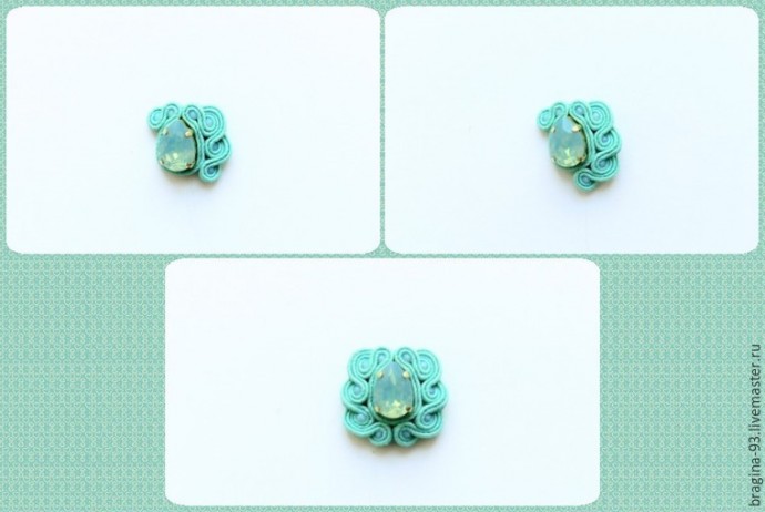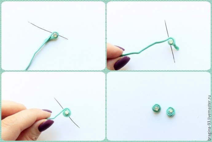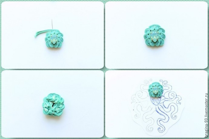 Для создания одного глазика нам понадобится шатон Swarovski. Обшиваем стразу сутажным шнуром по спирали, проводя иголкой через отверстия в оправе. 2-3 витка вокруг стразы будет достаточно. После зафиксируйте кончик сутажа на изнанке, проклейте его. Сделайте 2 глазика.