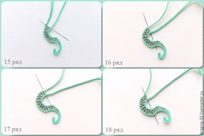 16 ряд: прошиваем иголкой через 1 бисеринку прошлого ряда и нанизываем на иглу 2 бисеринки, прошиваем сутаж.