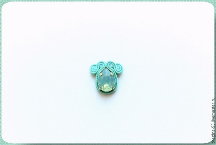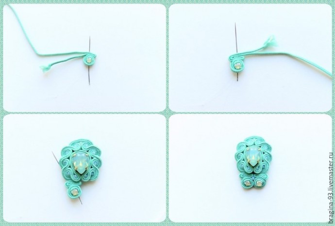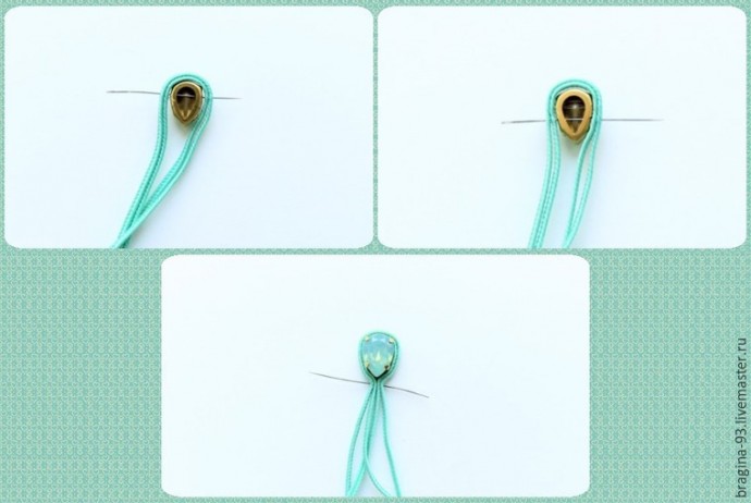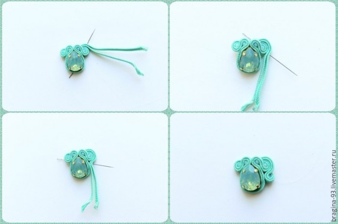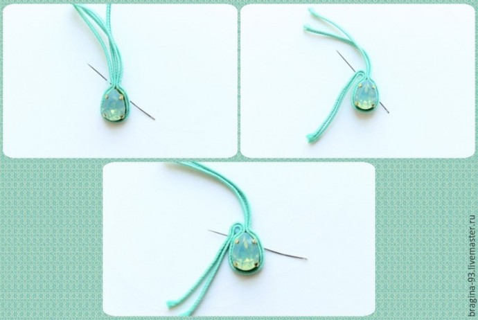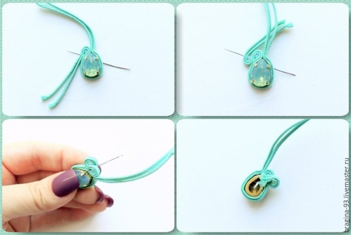 Заготовим 2 сутажных отрезка по 15 см, сложим их друг с другом и напополам. Работу начнем примерно от середины отрезков. Обшиваем сутажом кристалл, через отверстия в его оправе. По несколько стежков на каждую пару отверстий будет достаточно. Далее уводим иголку вниз, к пику кристалла, там сшиваем между собой все сутажные слои.