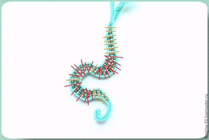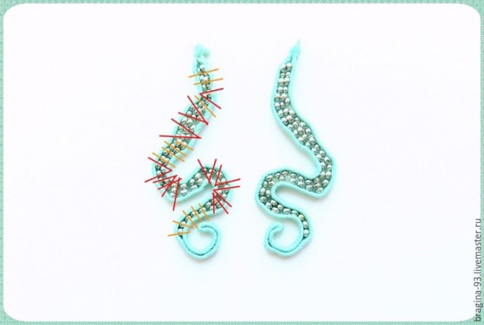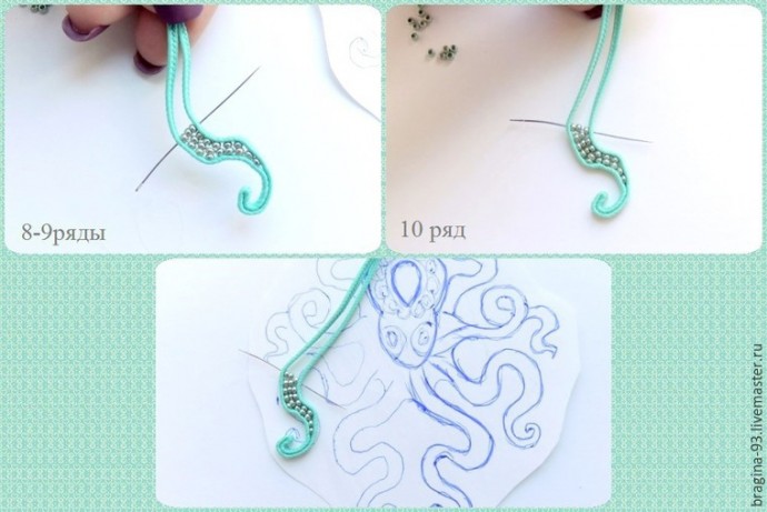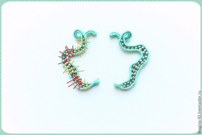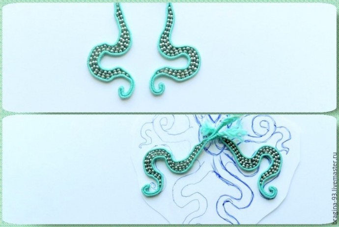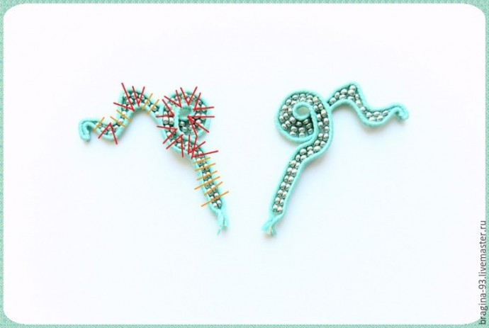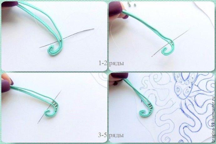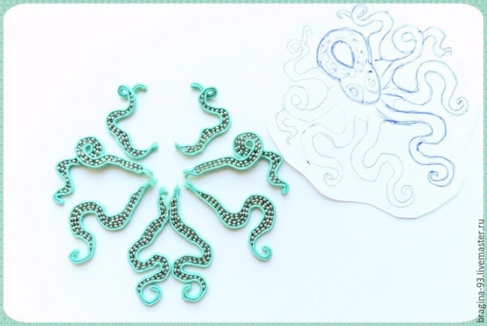 При шитье придаем сутажу извилистую форму, имитируя щупальце осьминога. Во время работы сверяем форму щупальца с эскизом, придерживаясь его. Заготовим сутажный отрезок длиной 20 см, сложим его пополам. Прошивать щупальце начнем с места сгиба сутажа. Первые 1,5 см прошиваем без бисера.