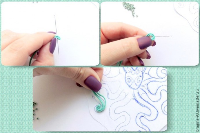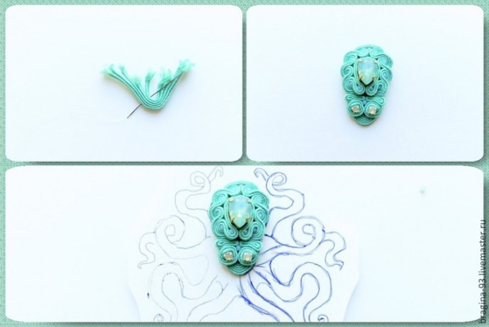 Пришиваем щупальца к изнанке следующим образом: вводим иголку в щупальце с изнанки и выводим ее с лицевой стороны строго между слоями сутажа. Обратно иголку тоже вводим между слоями сутажного шнура. 4-5 стежков будет достаточно. Торчащие сутажные кончики ровняем ножницами и прорабатываем клеем.
