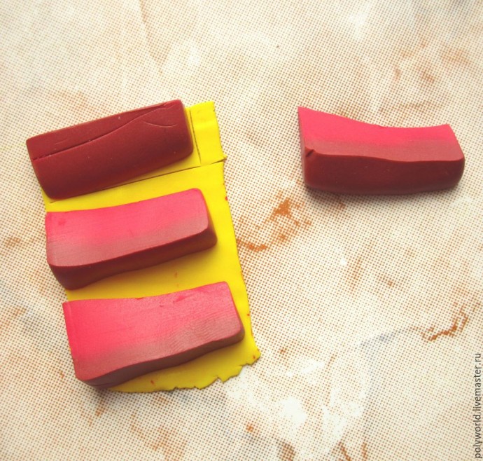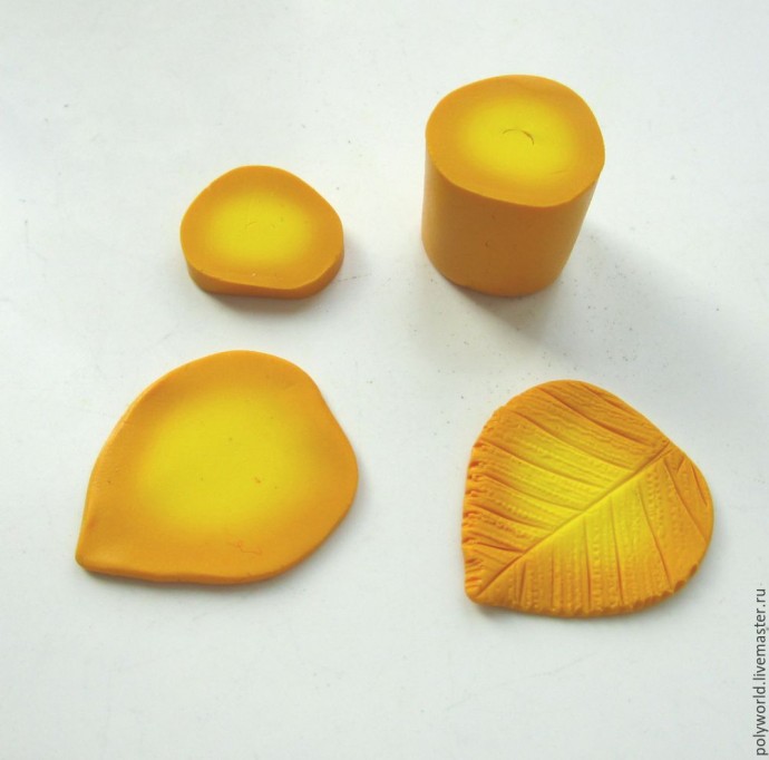 Полученную заготовку разрежем вдоль по оси симметрии, а каждую из половинок -ещё на несколько частей (по линиям будущих прожилок листа). Наложим эти кусочки на очень тонко раскатанный жёлтый пласт, обрежем по контуру.