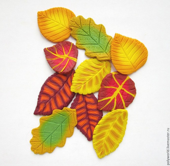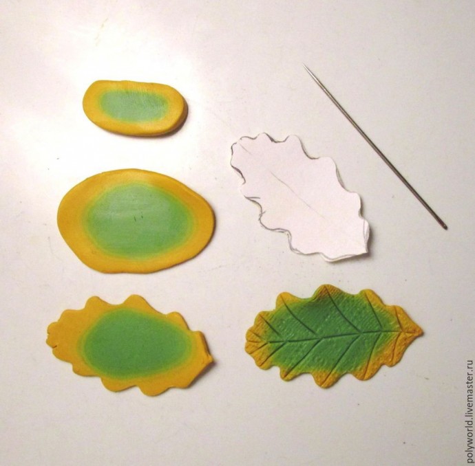 Следующий, четвёртый тип листочков — дубовые. Делаются подобным же образом, используем цвета - смесь жёлтого и охры плюс неяркий зелёный. Одно отличие от предыдущих — контур листика вырезается из подготовленного кусочка заготовки по бумажному шаблончику, нарисованному и вырезанному заранее. Ножом такие мелкие изгибы вырезать неудобно, поэтому делаю это острой иглой, держа её вертикально, тонкий слой глины отлично прорезается.