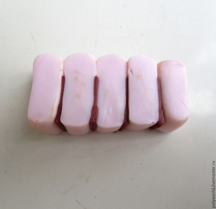 Режем заготовку на 5 частей и складываем так, чтобы тёмные прожилки оказались внутри. Сильно ужимаем заготовку, полученная колбаска имеет размеры на срезе примерно 1,5 см * 0,5 см.