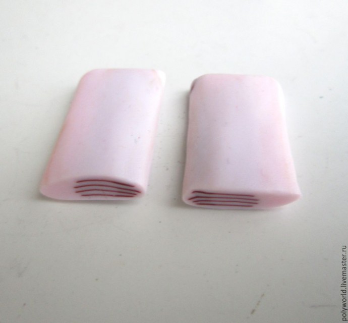Для лепестков цветка из розовой полупрозрачной глины делаем прямоугольную заготовку толщиной 6-7 мм, а кусочек смеси коричневой и бордо — раскатываем максимально тонко. Накладываем этот тонкий пласт на розовую заготовку так, чтобы он не доходил до краёв сверху и с одного бока, с нижнего края добавляем ещё узкую полоску.