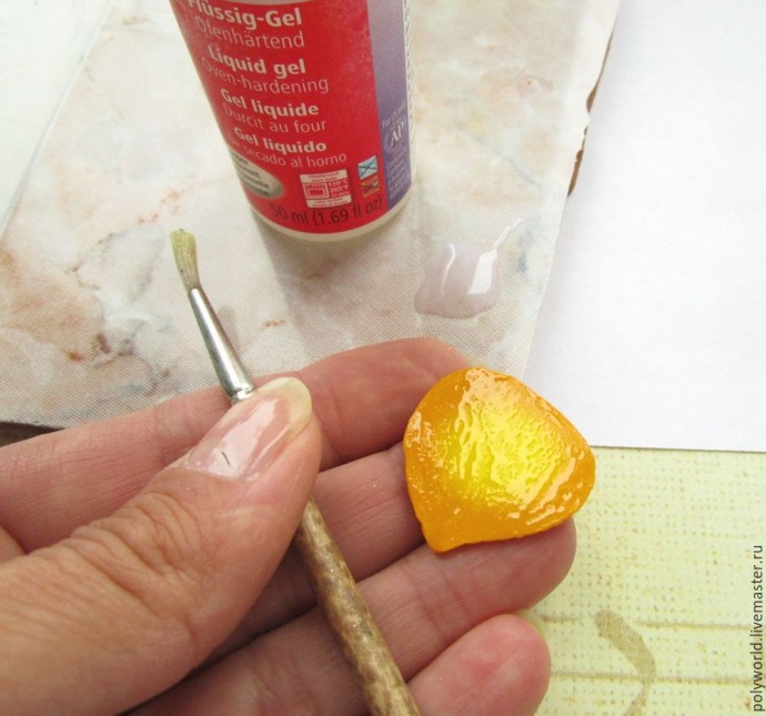 Наша работа близится к завершению! Осталось только запечь около 30 минут, при температуре, рекомендованной для конкретной марки глины (у меня Fimo, значит 110-120 градусов), а затем покрыть полуматовым лаком для полимерной глины. До запекания рекомендую сделать ещё одну вещь — убрать явные излишки геля со стекла при помощи ватной палочки, слегка смоченной в ацетоне (или жидкости для снятия лака с ацетоном).