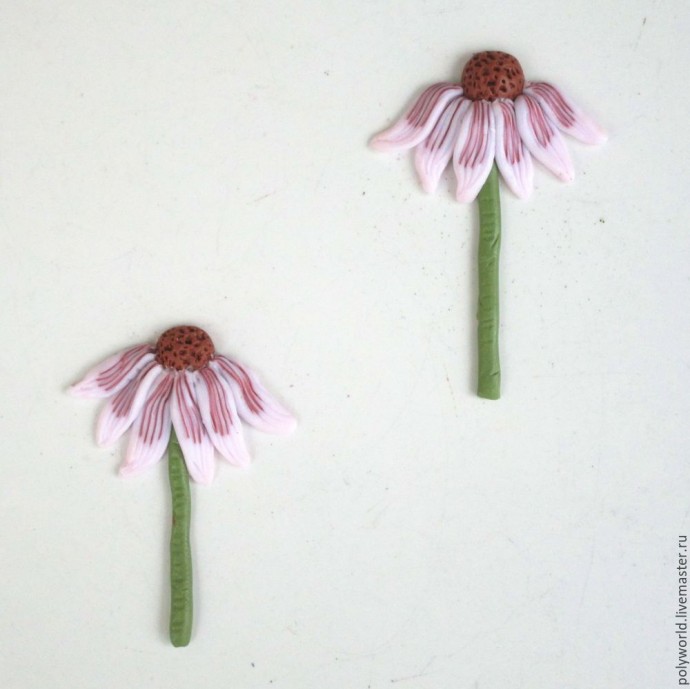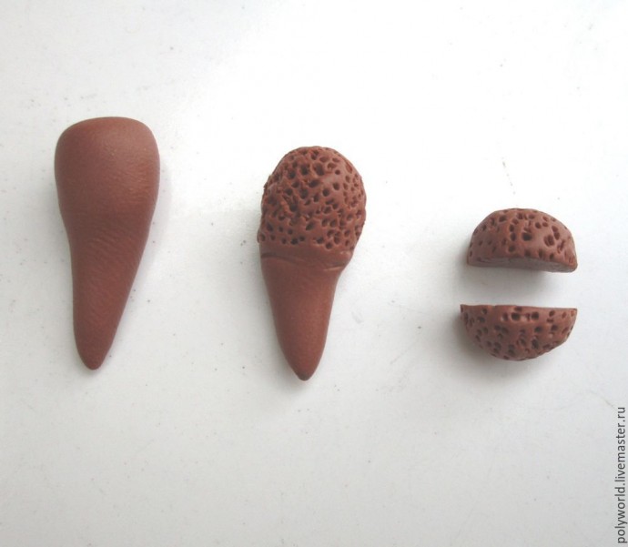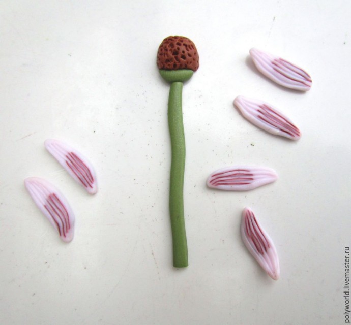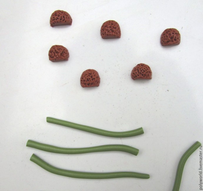 Из смеси коричневой и бежевой глины скатываем заготовки с округлым концом (это будущая сердцевина цветка). Держа за узкую нижнюю часть, иголкой придаю фактуру верхней части (просто многократно втыкаю иглу). Низ отрезаю, верх режу на две половинки, так что из одной заготовки получается две сердцевинки. Из зелёной глины с небольшим добавлением коричневой вытягиваем жгутики — будущие стебли.