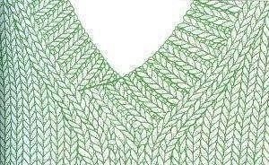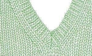 Если основание V-образного выреза горловины широкое, то лучше использовать пришивную планку, связанную платочной вязкой. Для этого нужно набрать на спицы, номером ниже тех, которыми вязалась основная работа, количество петель, равное половине числа петель, необходимых для требуемой ширины нижней части планки, и связать планку длиной, равной периметру горловины. Затем нужно выполнить плечевой шов «петля в петлю» и пришить планку потайным швом.