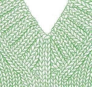 Когда желательно продолжить средний узор переда на отделочной планке выреза горловины (например, узор «коса», переходящий в оформление выреза), то убавление петель выполняют внутри узора: разделить петли переда пополам и, чтобы провязать край планки, не нарушая узора, ввести дополнительную петлю внутри каждой стороны. Провязать каждую сторону выреза отдельно.