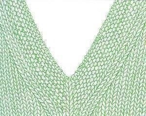 Набрать петли вдоль выреза горловины и провязать платочной вязкой ряд до средней петли. Для формирования угла нужно провязать лицевой вместе 2 петли, предшествующие средней петле, затем лицевой среднюю петлю, следующую петлю снять, не провязывая, затем следующую петлю провязать лицевой и перекинуть на неё снятую петлю. В следующем ряду на изнаночной стороне работы все петли, за исключением средней, вязать лицевыми, среднюю петлю провязать изнаночной.