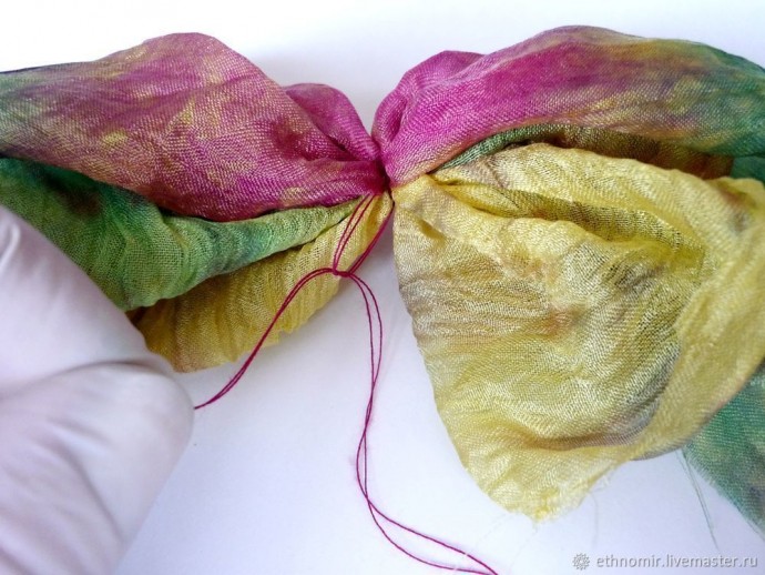 Нитками в цвет шёлка скрепляем лоскуты. Пары витков вполне достаточно, лишняя толщина ни к чему.