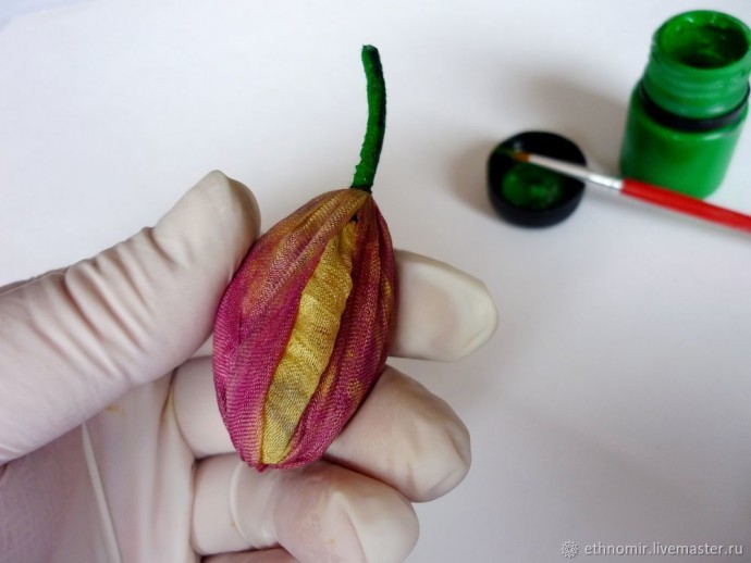 Чуть прогибаем стебелёк. Подкрашиваем зелёной акриловой краской.