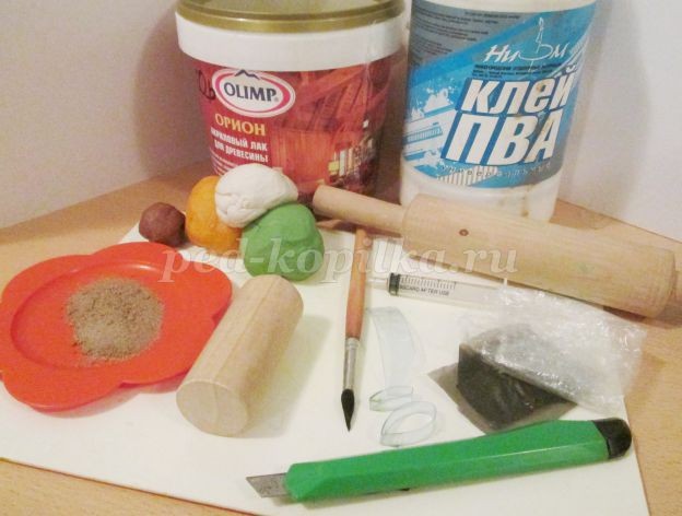 Материалы: 4 цвета соленого теста – зеленый, жёлтый, коричневый, белый ; клей ПВА; кисть; формочка-листок большая и маленькая; лопаточка (можно пользоваться и стеком); скалка; доска для раскатывания теста; кусочек пищевой пленки; цилиндр (я использовала цилиндр от детского строителя); 3 кусочка пленки, 3 см на 3 см (можно отрезать от полиэтиленового пакета), палочка с круглым концом; речной песок (выкрашенный в коричневый цвет); канцелярский нож.
