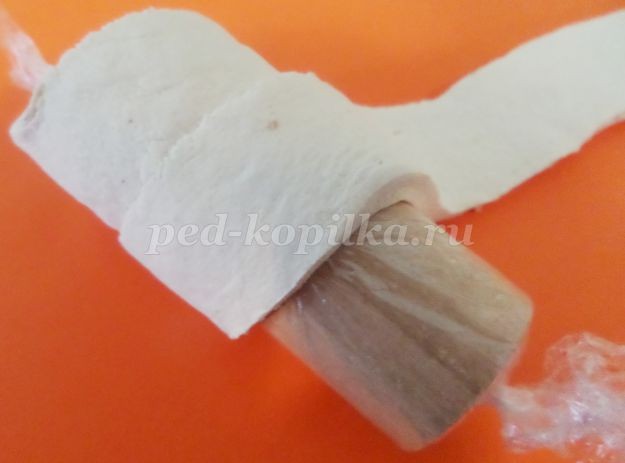 3. Полоску из теста обмотать вокруг цилиндра, излишки теста срезать. Даем полностью высохнуть работе, как правило, на это уходит несколько дней.