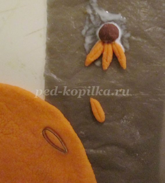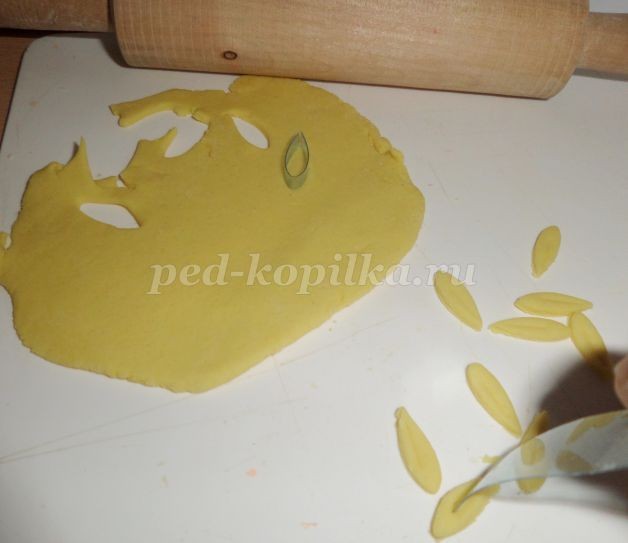 6. Раскатываем желтое тесто. Вырезаем малой формой-листком 20 – 21 лепесток. Лопаточкой посередине делаем прожилку лепестка.