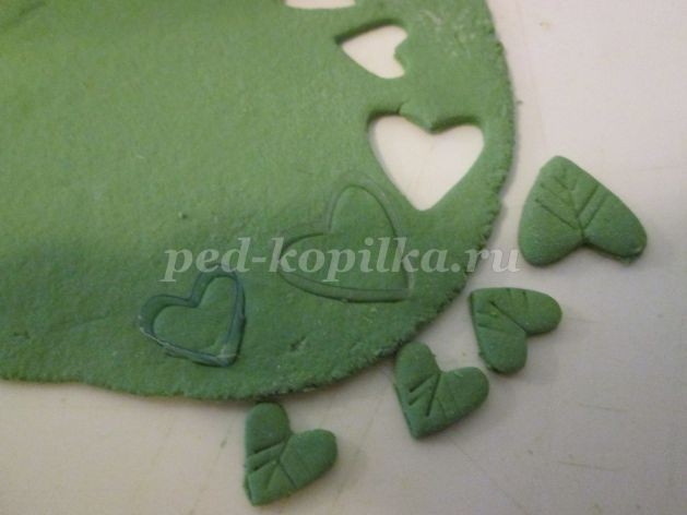8. Зеленое тесто раскатываем тонко (2 мм) и большой формочкой-сердечком вырезаем 5 листочков. Маленькой формочкой-сердечком вырезаем 3 листочка. Лопаточкой делаем прожилки у листочков.