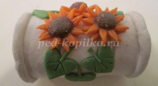 Из зеленого теста скатать короткие тоненькие колбаски по количеству листочков, закрепить их у основания листьев.
